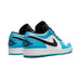 - Jordan 1 Low UNC 2021 se prezentuje s bílým koženým svrchem s nátěry univerzitní modré a černým Swooshem.